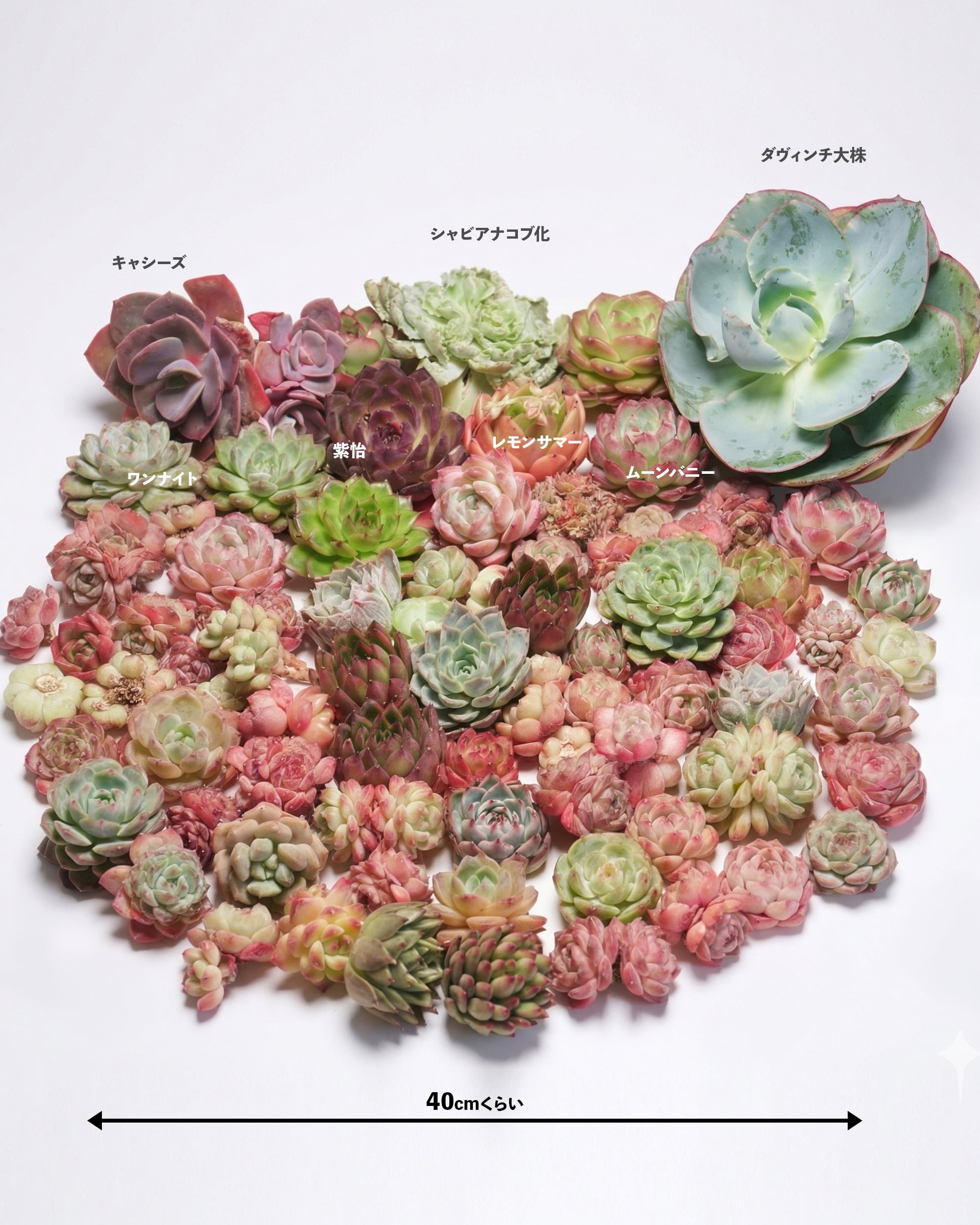 目玉はこちらの「60サイズ限界詰め合わせセット」です。新しくなったゆうパックの箱に、これでもかというくらいギッチギチに詰め込みました。名前のわからないコが主体ですが、きれいな色のコばかり。さらに名札付きのレギュラー品種もいくつか入っています。