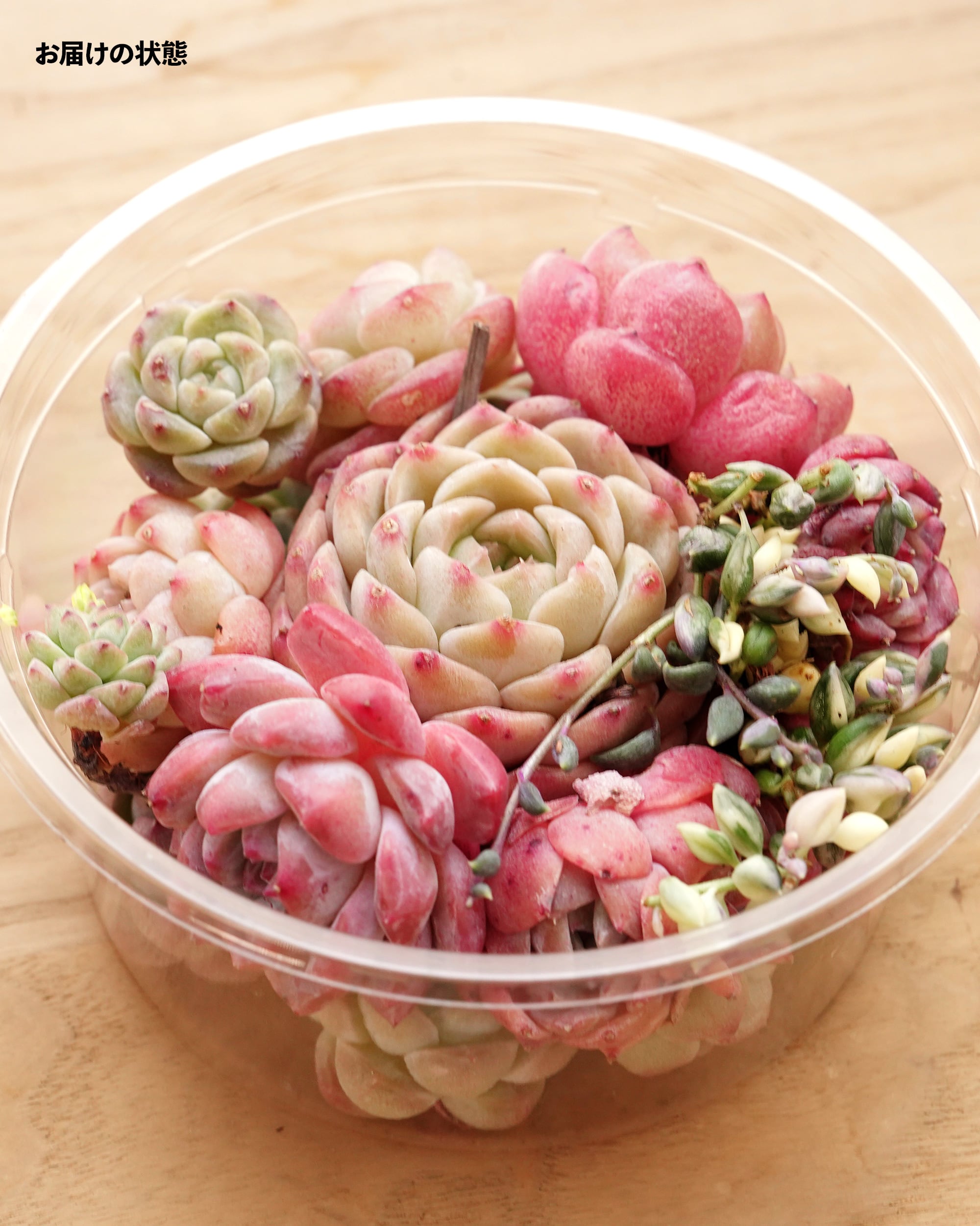 こちらは、名前のないミックス多肉植物の中から、きれいめなニュアンスカラーでまるっこくてかわいいコたちを厳選して、クリアパックにギッチギチに詰め込んだセットです。