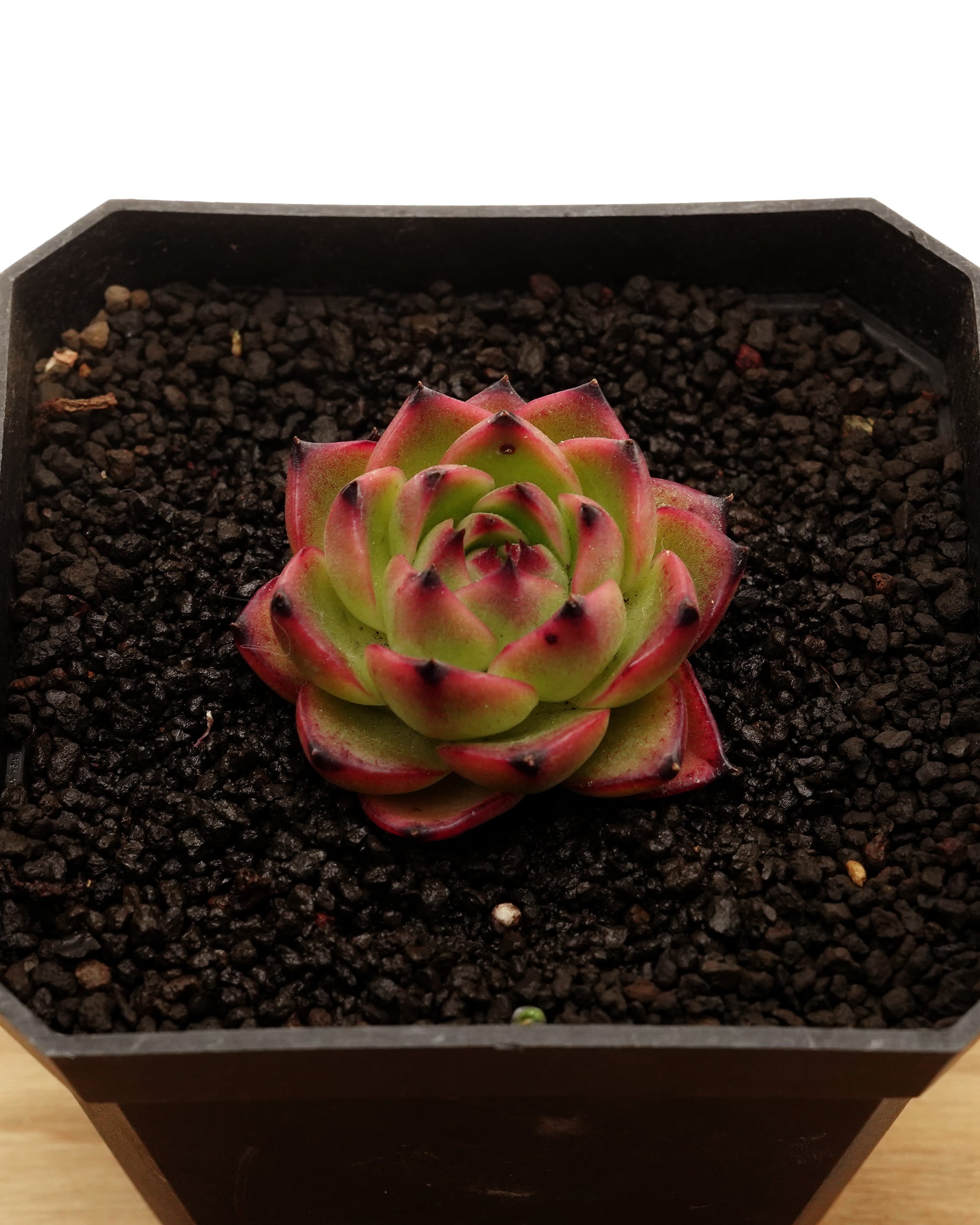 ツヤ感のある明るいグリーンのボディに赤い爪を密に纏うアガボイデス系ハイブリッド。詳細は未明。ブルードラゴン E. 'Blue Dragon'に似てるけどこちらのほうがコンパクトで、もしかしたらダークナイト E. 'Dark Night' のように赤黒いツメを魅せてくれるようになるかも。