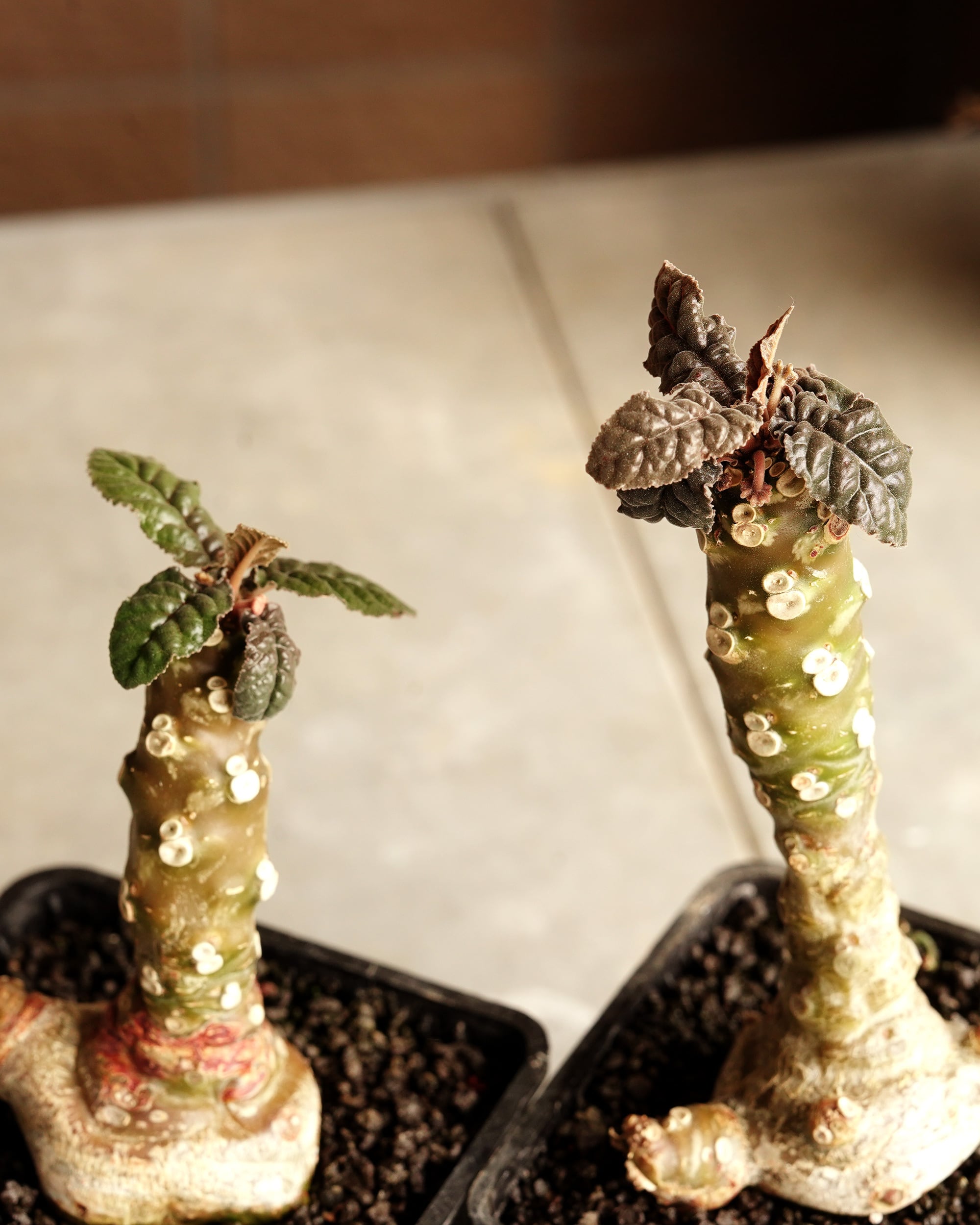 根塊植物として人気のドルステニアですが、こちらは少し珍しい「エラータ」という名前で入荷したコです。秋からLEDの下でじっくり養生させて、ようやく明るい色の葉が動き始めてきました。ただ、葉があまり大きくならない気配もあって、もしかしたら「フォエチダ」かも?という疑惑が浮上しています(笑)正体は育ってみてのお楽しみということで、今回はその「謎」も含めてお手頃な価格に設定しました。一緒に謎の解明に挑戦してみませんか? 同等の株がいくつかあるのでセレクトはお任せください。