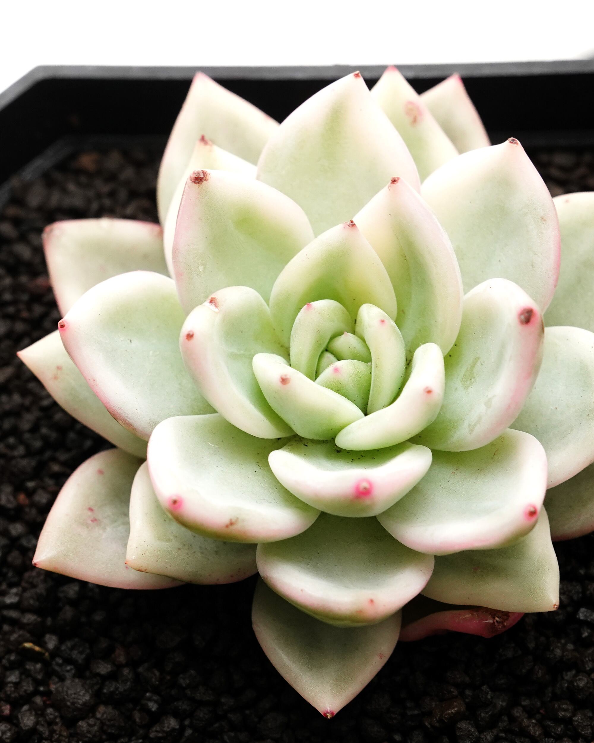 もうすっかり定番の品種感のある「シャンペーン E. 'Champagne'」の斑入り品種。白覆輪と、ほんのりストライプで爽やかな印象に。フォルム、ホワイトパウダーで少しマットな質感、殆ど見えないけどウォーターマークがあるところや、葉先の赤いティップはまさにシャンペーンですね。「インディゴエボニー錦 E. 'Indigo Ebony Variegated'」に似ていますがこちらのほうが色がさわやかで葉っぱが短くむっちりした印象。「クリスタルジェニーマリア錦 E. 'Crystal Jenny Maria' Vairegated」に似ていますがこちらのほうが葉っぱがワイドでショート。