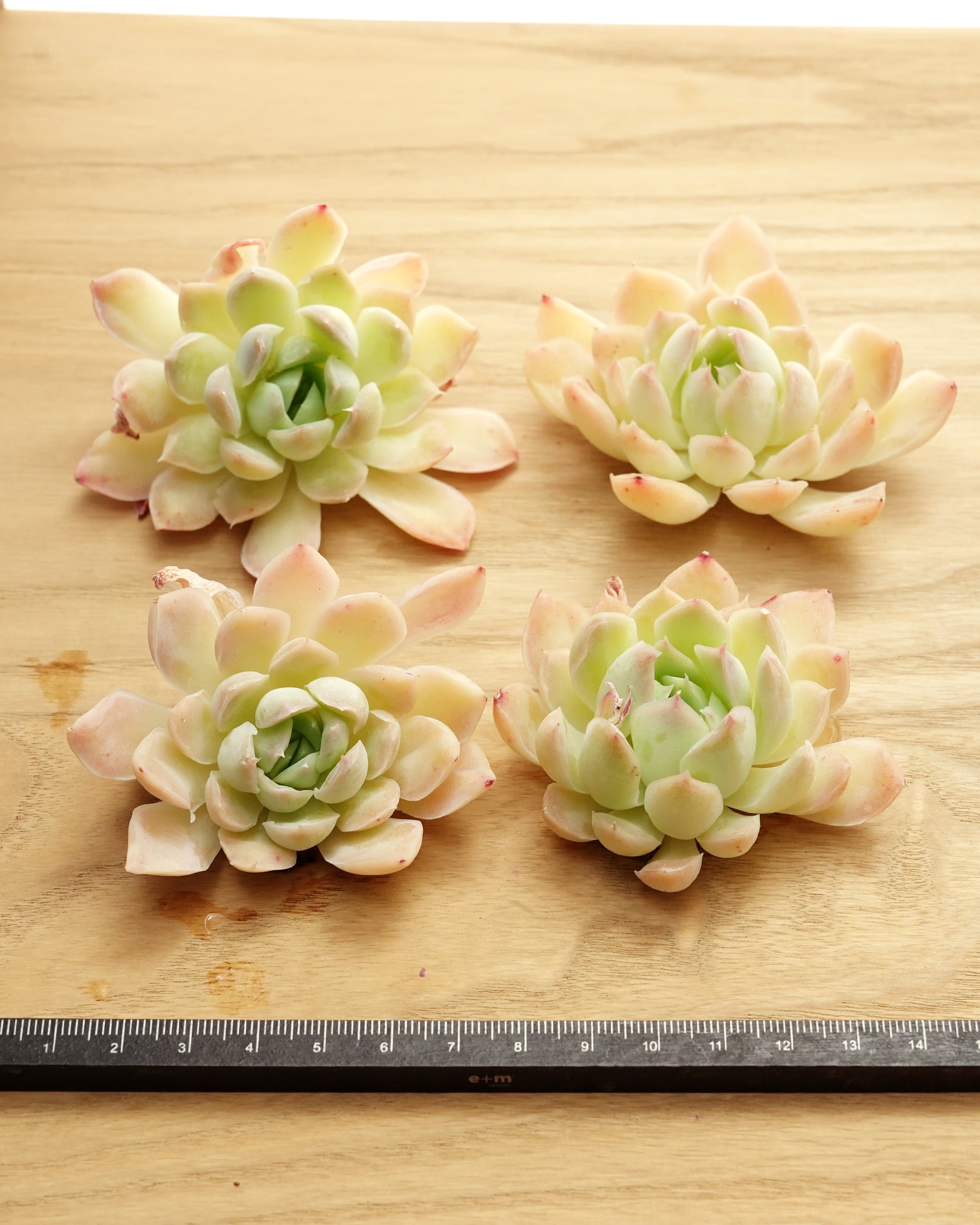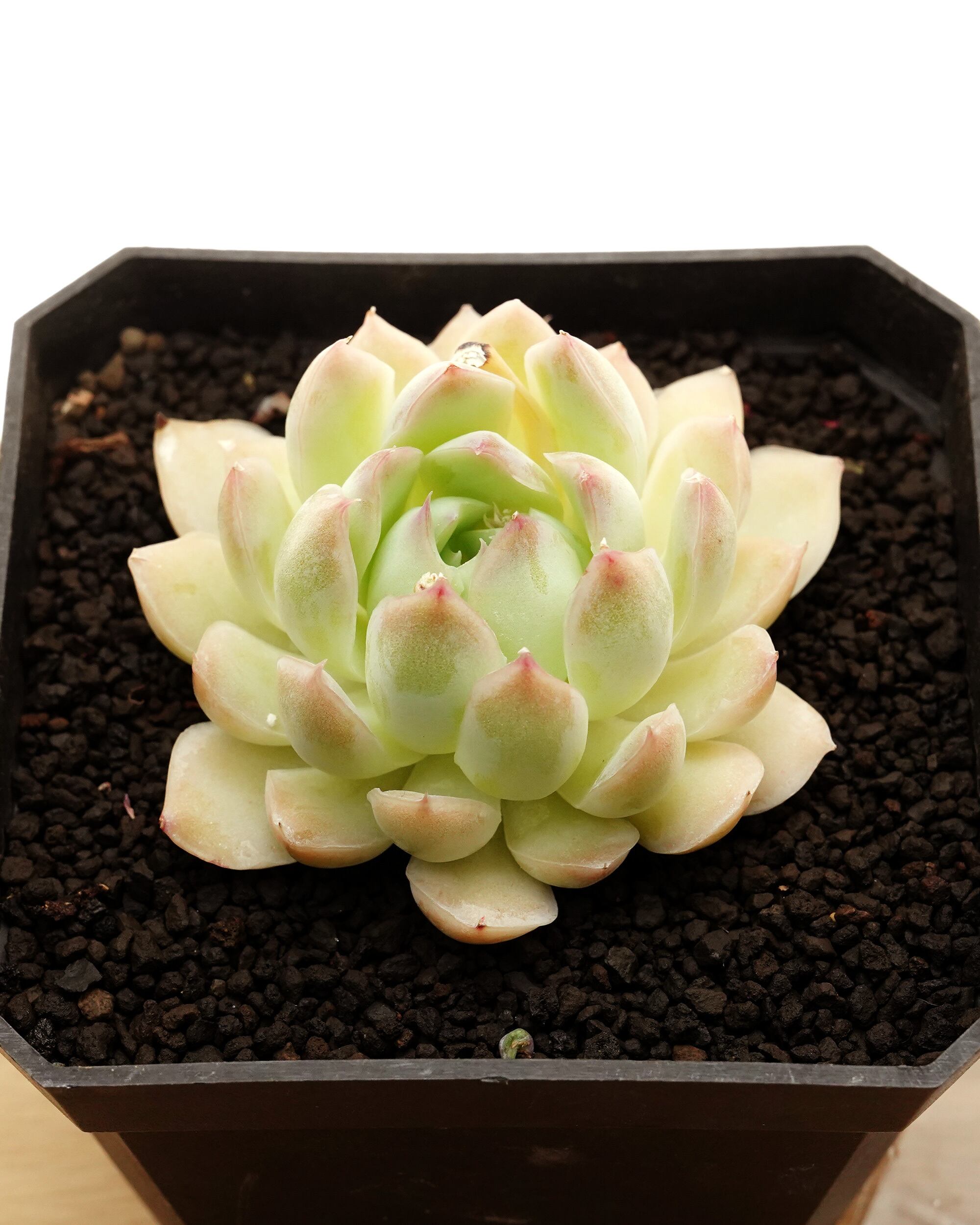 遠目には真っ白に映るくらい明るいカラーの、ほんのりオレンジ系に色づくグリーンの長い葉っぱが、細く儚く美しいヒロインの名前によく似合うニューフェイス(この名前の品種が今までなかったのが奇跡かも)。白系ハイブリッドといえば「アルバ E. elegans 'Alba'」ですが、葉っぱの細長さとオレンジ系のカラーで印象はだいぶ異なります。韓国のハイブリッド生産者チャンヒ—農園さんのオリジナル品種で、ご両親は「ラズベリーアイス E. 'Raspberry Ice'」と「花うらら E. pulidonis」のハイブリッドという意外な組み合わせ。