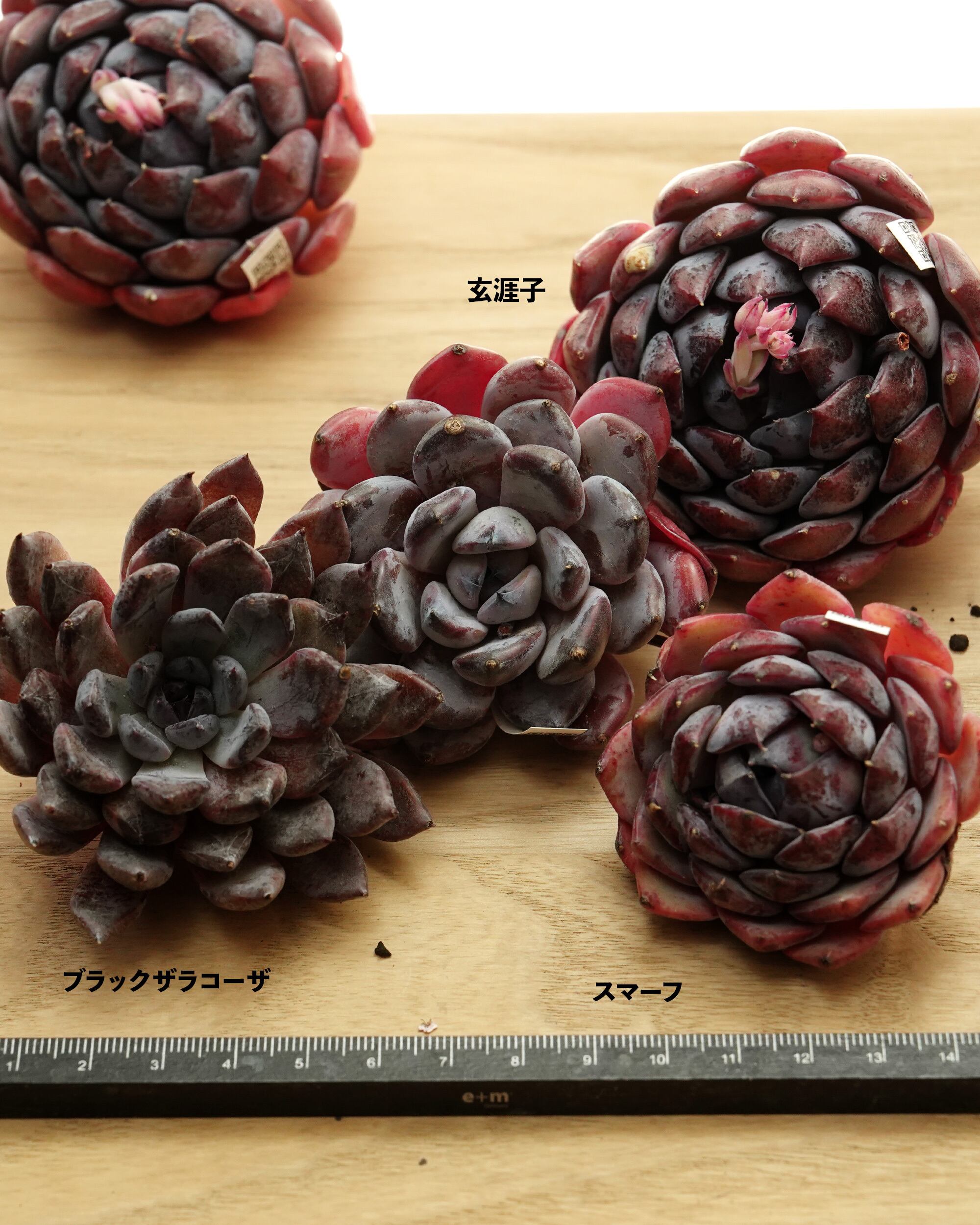 2025年ごろから見られるようになったダーク系エケベリアのニューフェイス。葉先のとがったやや短めで密な葉っぱ。ダーク系ながらホワイトパウダーが厚く、「ブルーベリー E. 'Blueberry'」に似た雰囲気だけど、より外葉の赤味が強い感じ(季節的なものかもしれないけど)。おそらく中国生まれで「玄涯子 Xuán yá zǐ シュエン ヤ ズー」がそのまま入ってきています。たぶん「神秘的な世界の果てを知る者」と言った意味の造語。