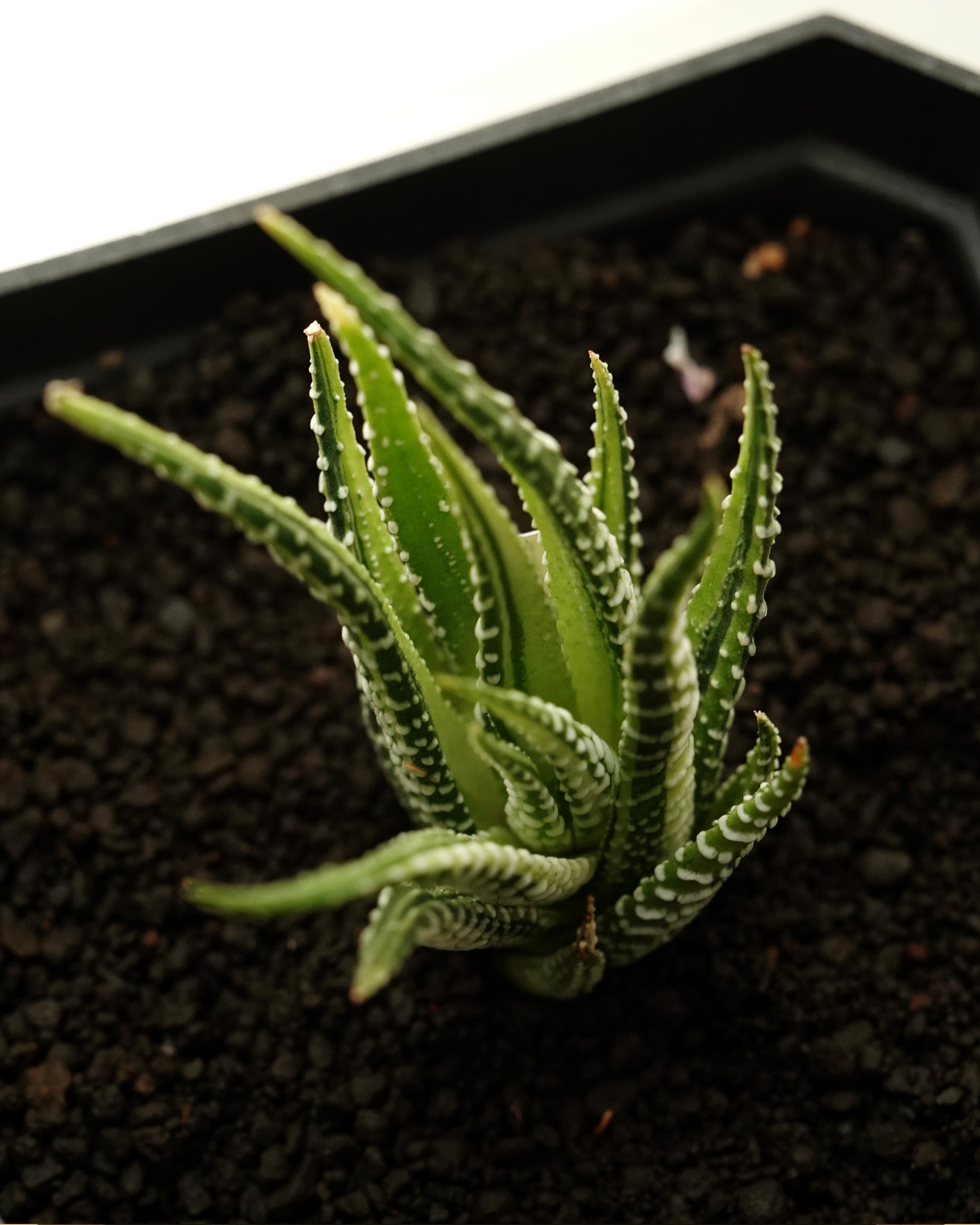 「ハオルチア 十二の巻 Haworthia fasciata」の斑入りタイプ。「白帝」は固有の品種名というよりも「なんとなくこういう傾向がある」といったタイプ名に近い印象で、実態としては一般的な「十二の巻」によく似ていて強いて言えば白ストライプが強めに出ているのが特徴。もしかしたら「白蝶 Haworthia fasciata 'Hakucho'」のような曙斑が出てくるかもしれませんが今のところ未知数。この手の斑入りタイプは成長段階やカキコなどでころころ表情を変えるので何とも言えません。