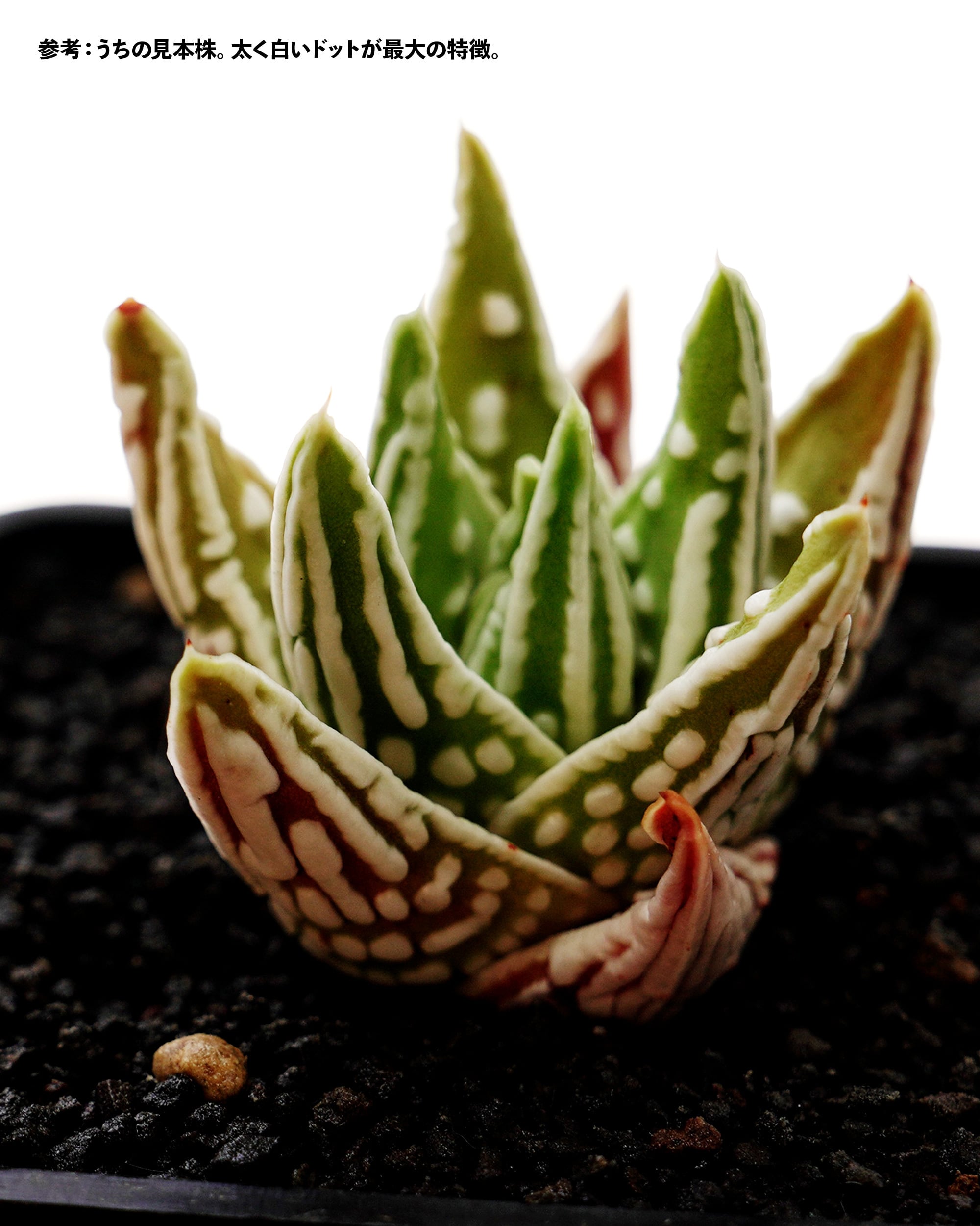 白く大きなドットが縦に並ぶインパクトのあるコ。高価なハオルチアの代名詞というブランド品種。漢字違いの「天使の涙」は別品種とされているのでご留意ください。日本生まれのハイブリッドで、「冬の星座 H. papillosa」と「アストロロバ 天守閣 A. skinneri」との交配種とされています(L. Llifleはプミラ H. pumila の園芸種としていますね)。「皇帝 H. 'Koutei'」はよく似ているけど別種で、こちらのほうが柄が太く大きいのが違い。