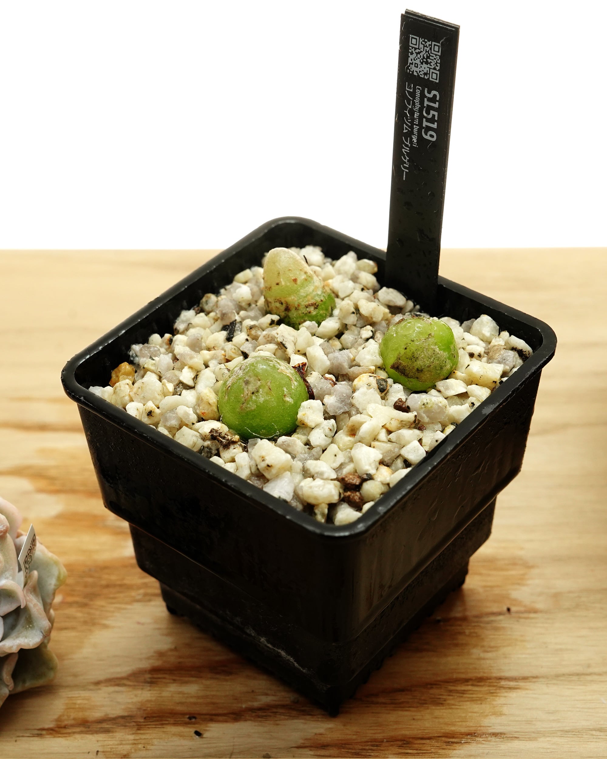 ツヤツヤの緑色の丸い物体。水まんじゅう? 鉱石? などなど、多くの人にこれが植物だと信じてもらえない不思議なフォルム、それがこのブルゲリ。そもそも不思議な生態のコノフィツムの中でも特に際立って不思議な個性派(ハンメリ C. hammeri がかろうじて似てる)で、ほとんど分頭せず、自然環境では脱皮せず、白い薄皮を何重にもかぶって周りの白い石英の岩の中に隠れて過ごしています。最大で4cmくらいまで生長。薄皮のない状態では30~50%くらいの遮光が理想的で、水を好むのでカラカラの状態を避けるなど、見た目通り繊細な扱いが必要。