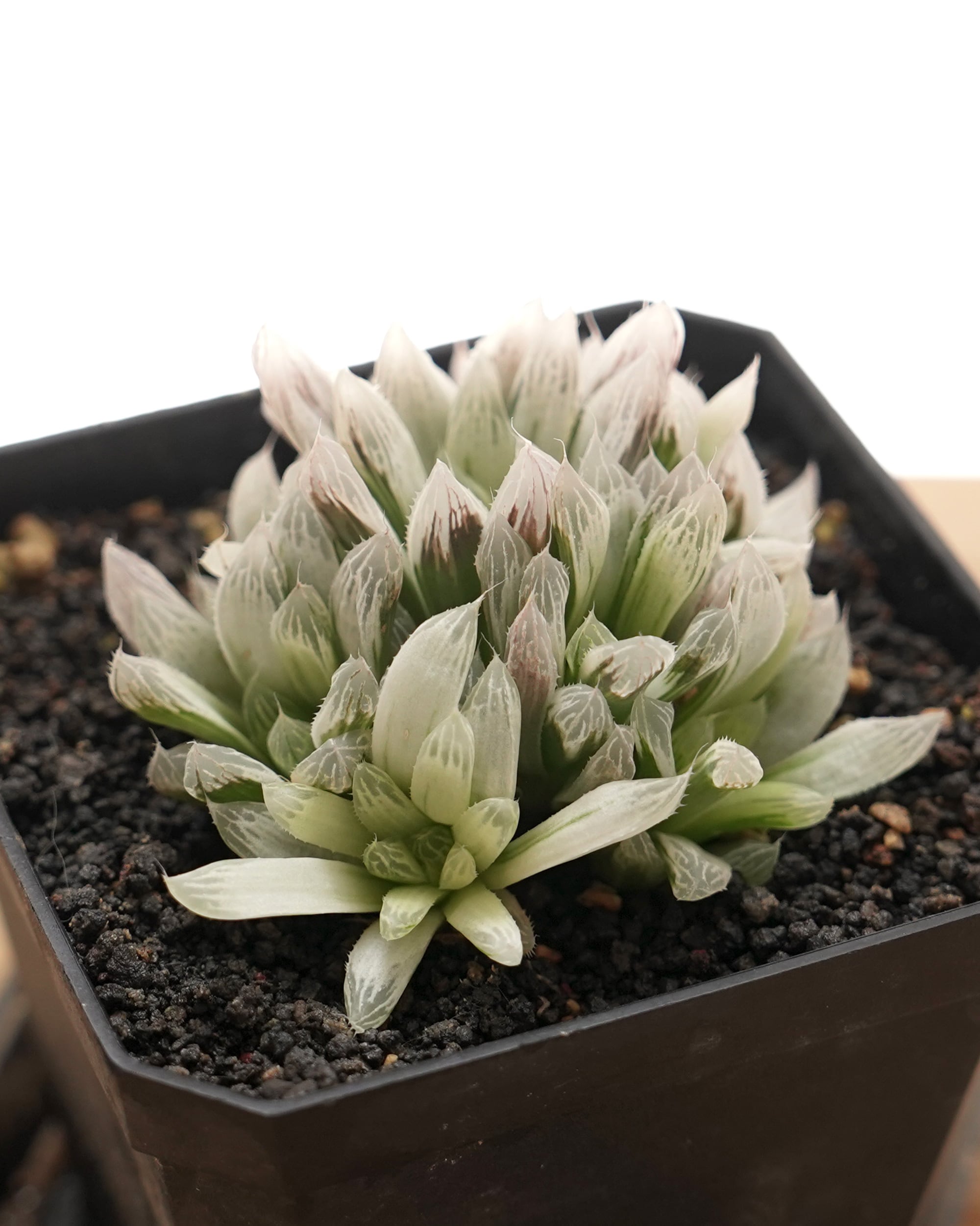細い葉っぱを伸ばした先に三角形の窓を拡げるピリフェラ系ハオルチアの斑入りタイプで、ほとんど真っ白なボディにかすかに緑色をにじませるいわゆる「糊斑」の中では飛び抜けて普及種価格帯で手に入れやすいコ。超高級種として有名な「白蛇伝 H. 'Hakujaden'」に似ているんだからもっと評価されて然るべき。ちなみに以前から日本で流通している白水晶(ピリフェラ錦) H. cooperi var. pilifera f.variegata とは同じものだと言われています。「白斑玉露」でたまに高い値段がついていることがありますがその場合「白水晶」で探してみてください。