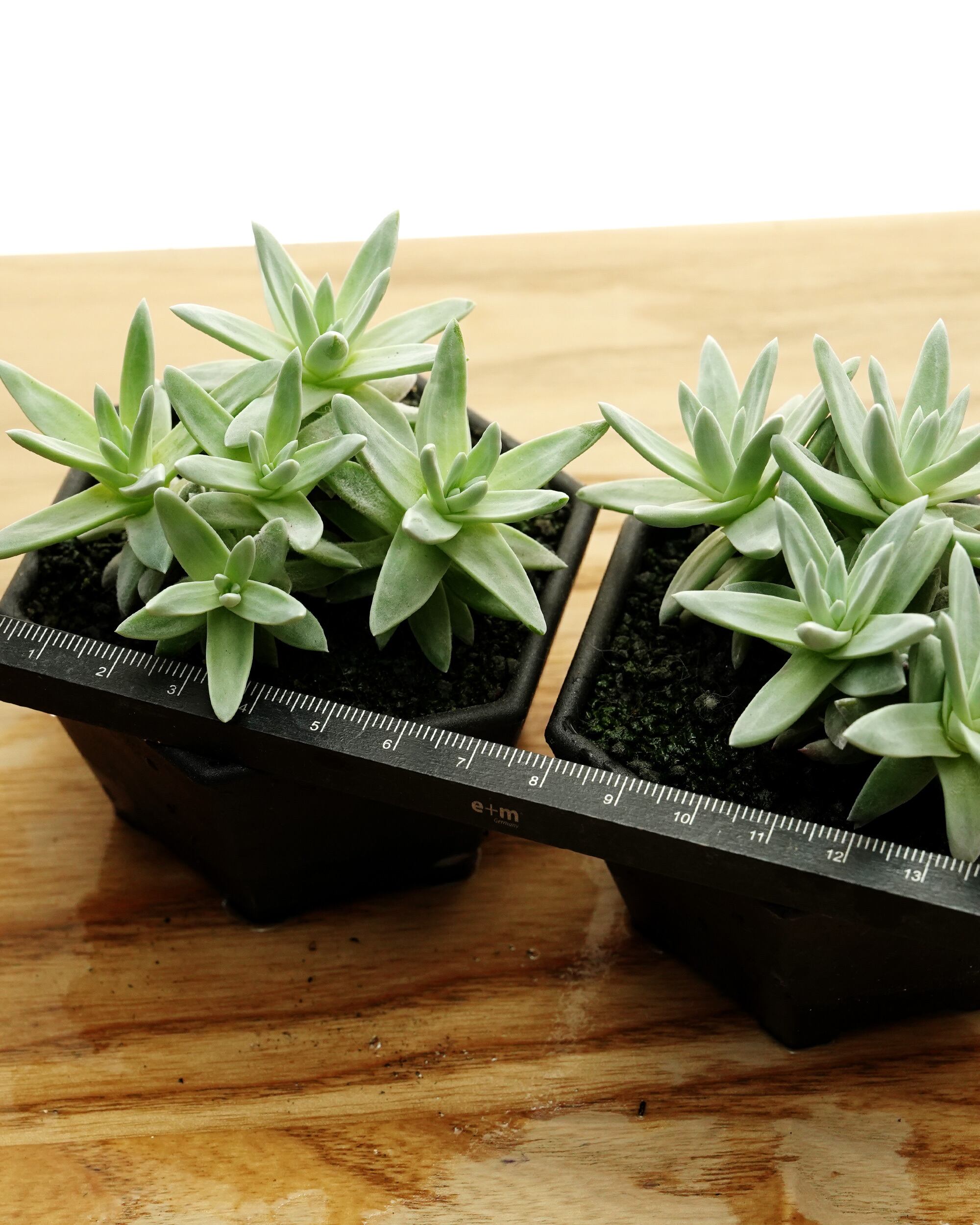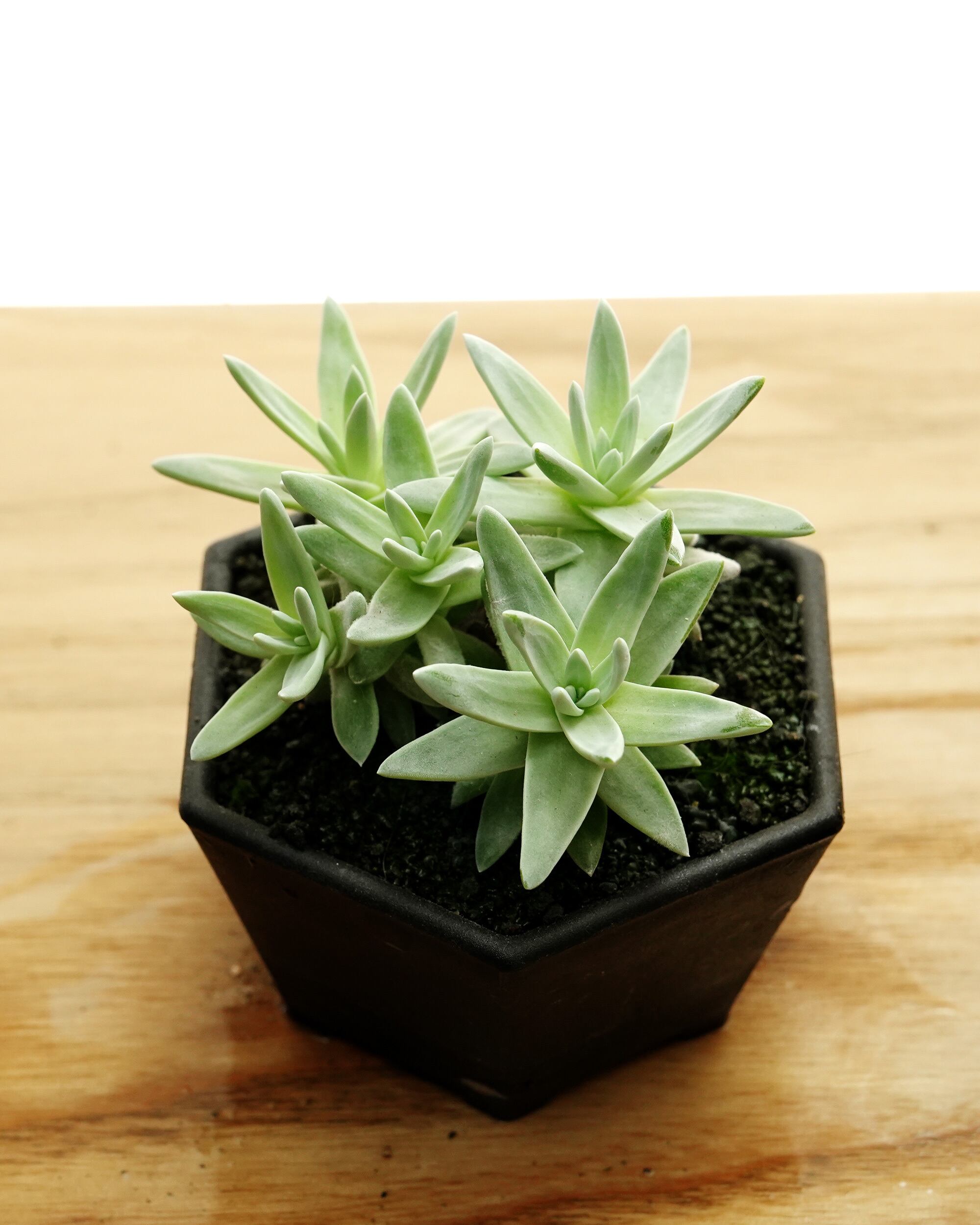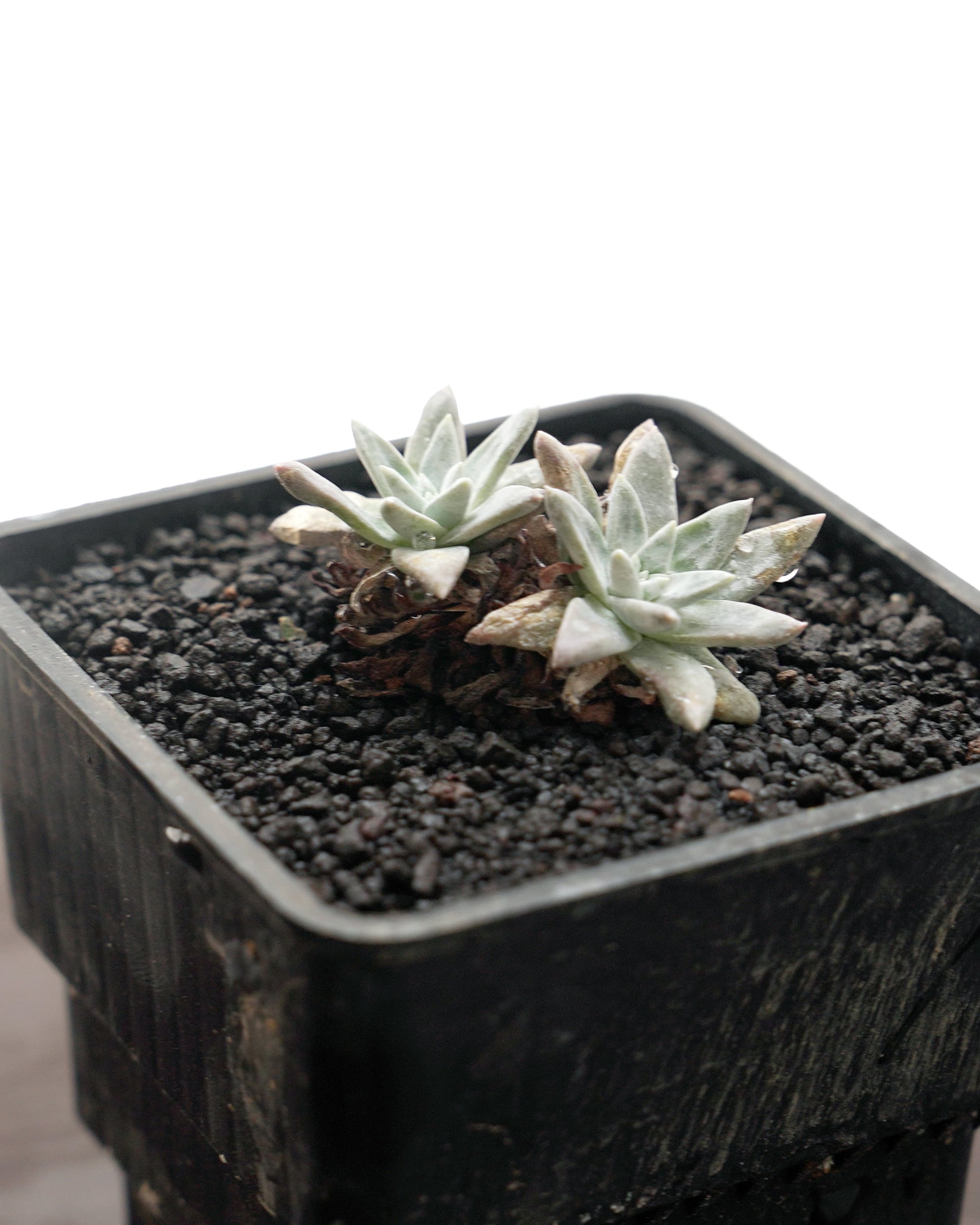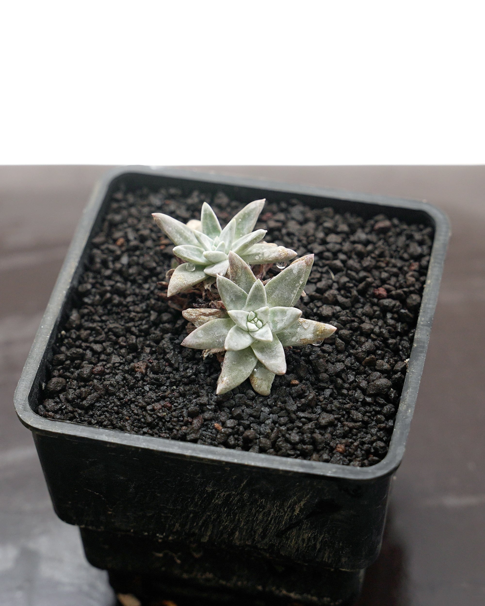 小さな星型のロゼットをたくさん群生させる星空タイプのダドレア。グリーニー D. greenei に良く似ていてその区別はプロでも難しいと言われています。とはいえグリーニーはロゼットの大きいものや葉っぱがむっちりしたものなど個性豊かな雰囲気ですが、グノマは基本的にこのフォルム。もしかしたらグリーニーは名前が有名だからよく似たコとごっちゃにされている可能性は否定できず、であると「小型群生ダドレア」をお探しの場合はグノマの名前で探したほうが正解に近いかもしれません。故郷はカリフォルニア沖のサンタローザ島。