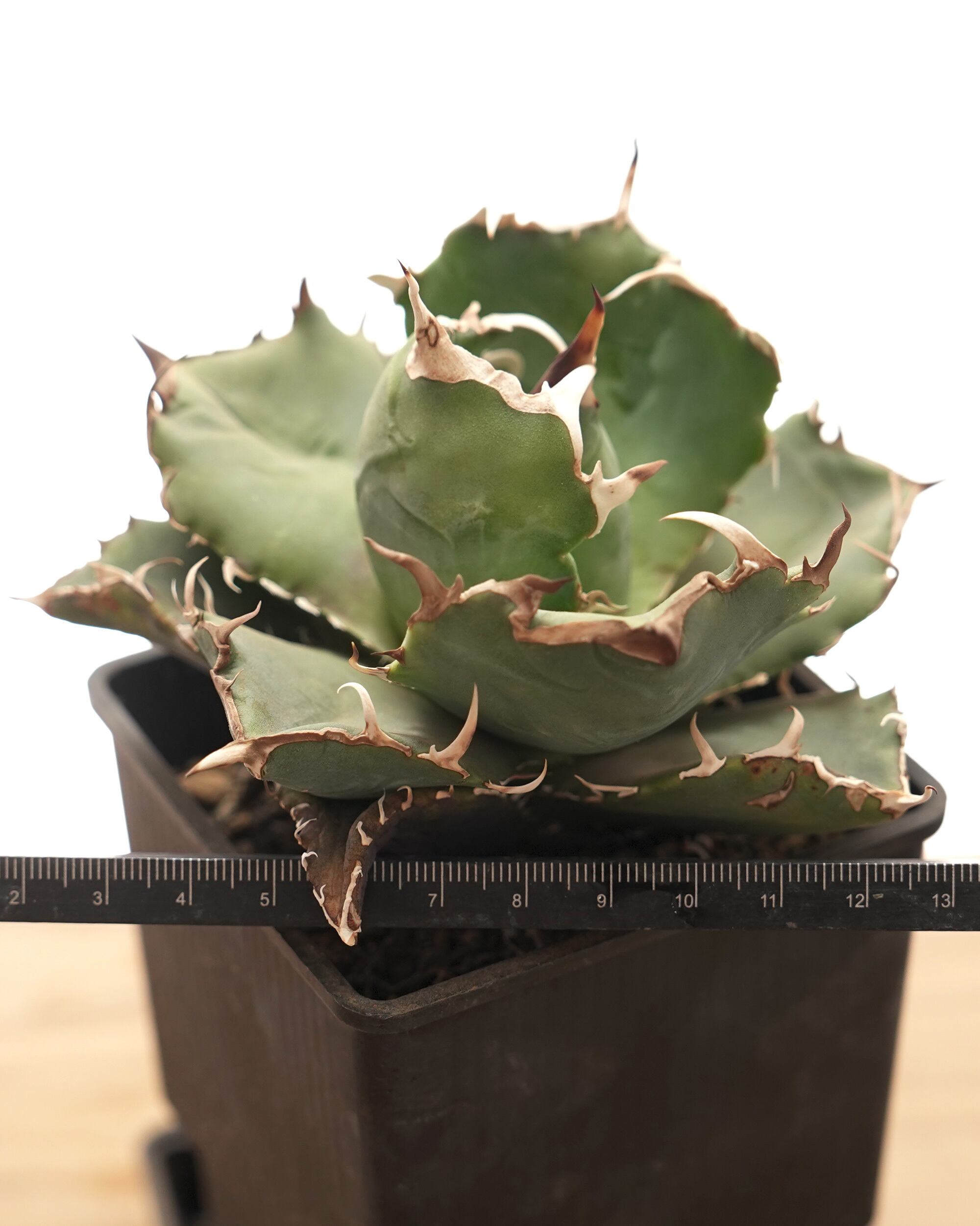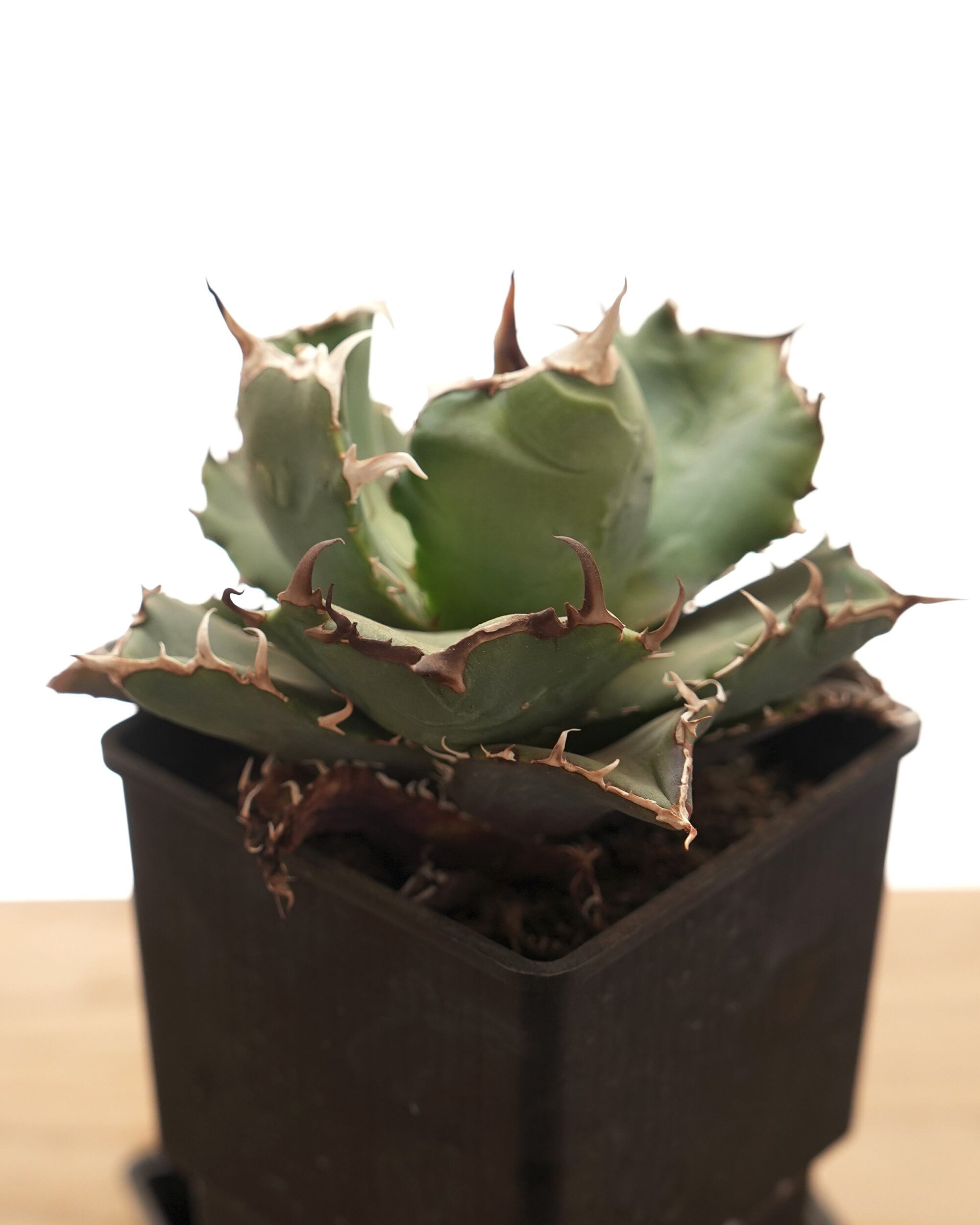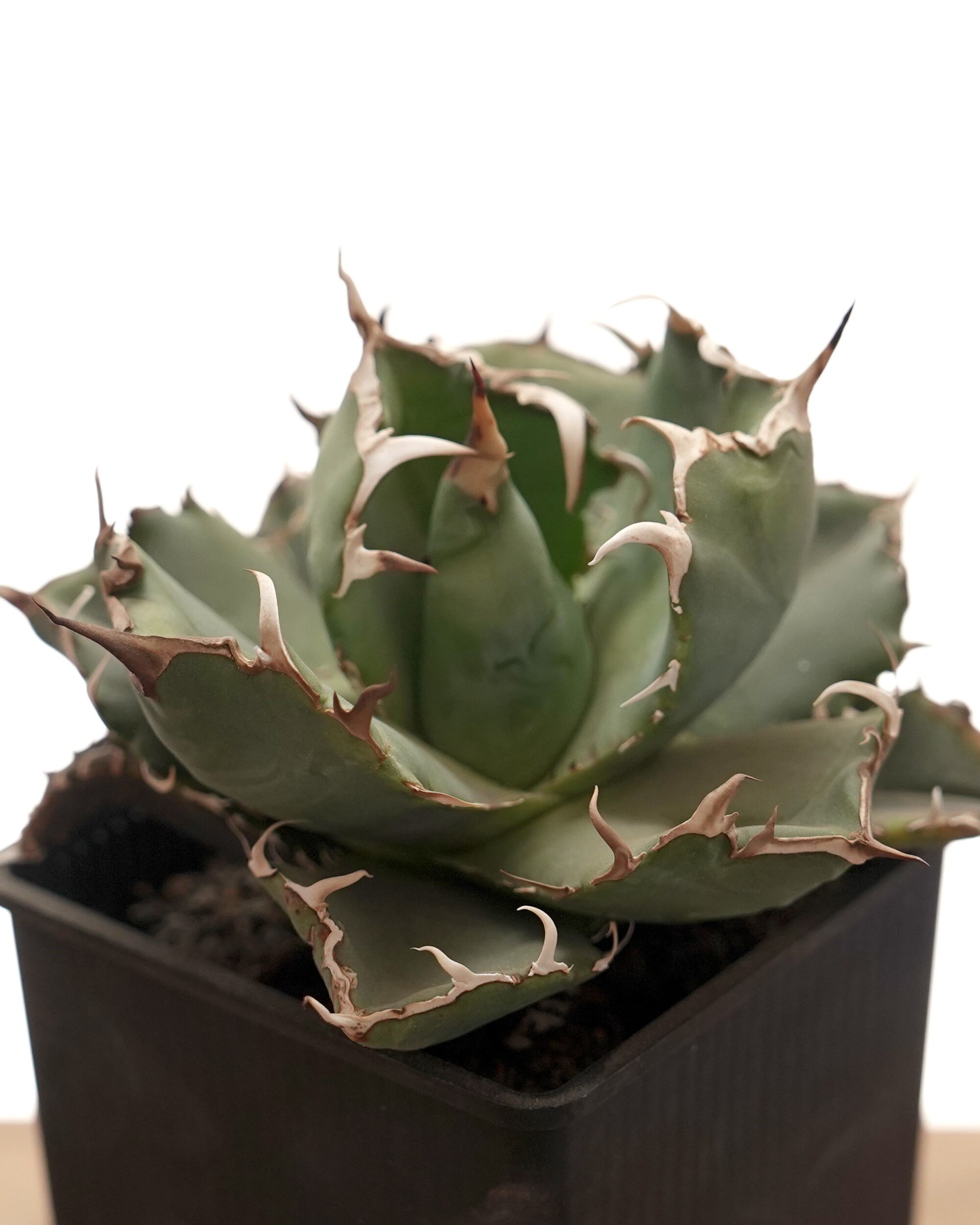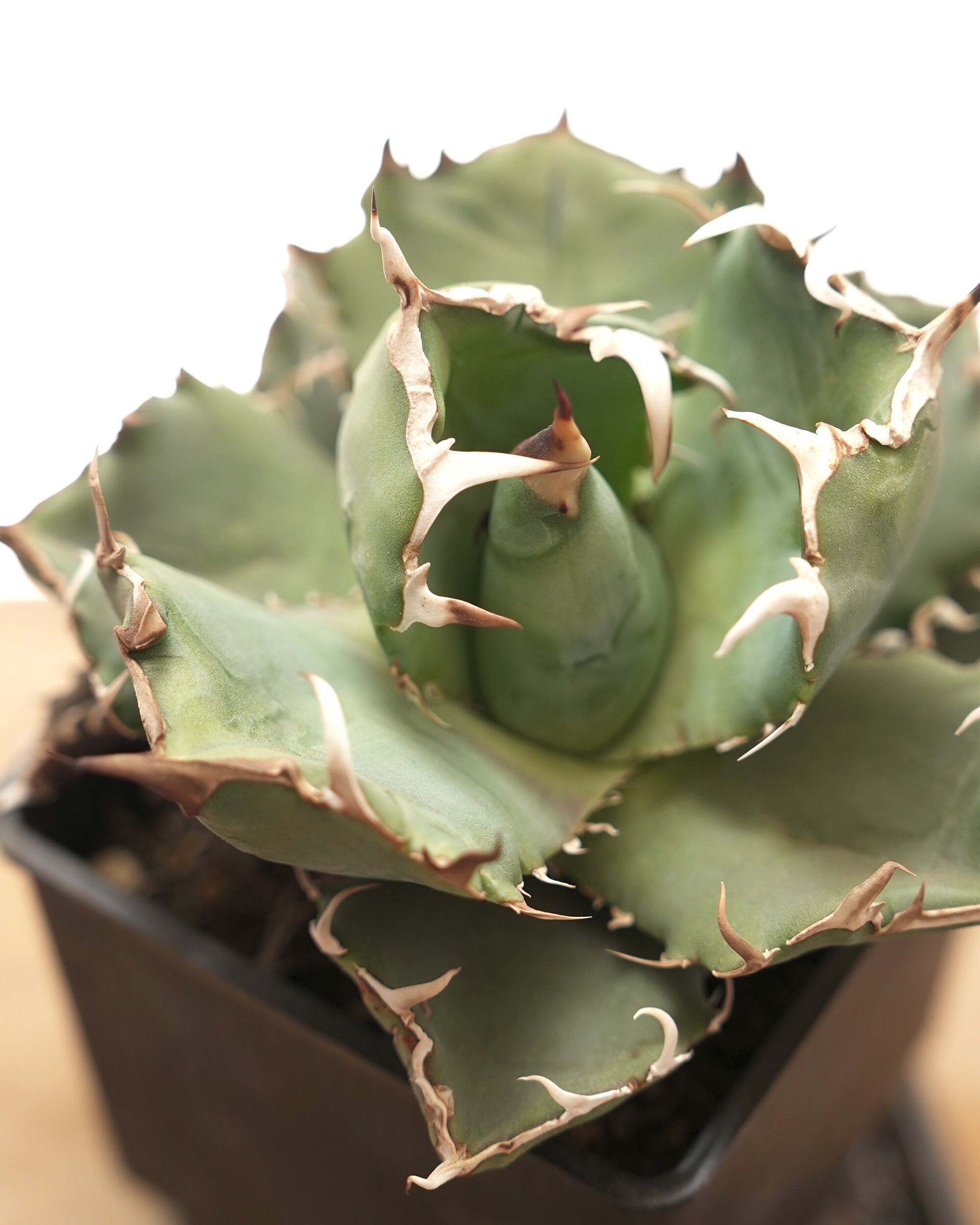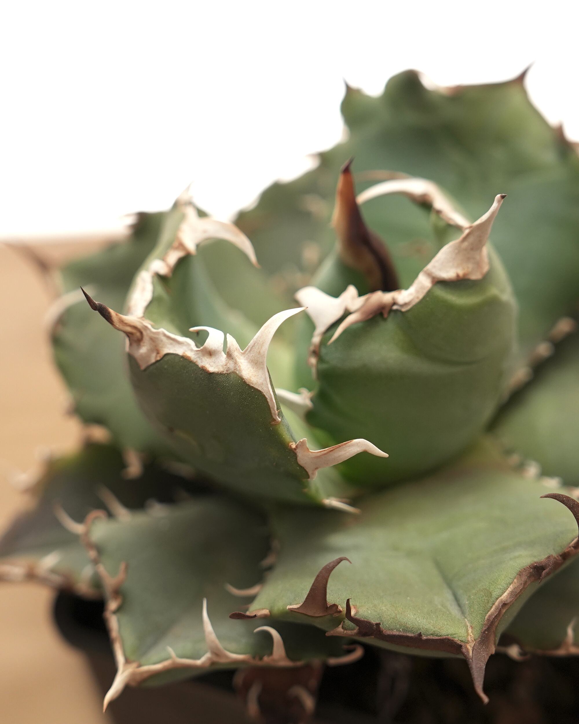 アガベチタノタ A. titanota の馴染み深い園芸品種。古くから日本にあるけど近年のアガベブームの火付け役として人気なのは、台湾や中国から入ってきているクローンで、逆に日本にあるものは「旧来白鯨 A. titanota 'Hakugei' traditional」と呼んで区別しています。どちらも強光線で締める環境では、ブルーグレイの短く丸い葉っぱ、白く細いマージンにウネウネとした小さいツメがその特徴。ネームドの中では比較的葉っぱが外巻きに広がりやすい感あり。「福建白鯨(=小雨新白鯨) A. titanota 'Fukken Hakugei'」は別系統。他にも「白鯨っぽい特徴が出た実生」にも「〇〇白鯨」とネーミングされる傾向があるのでいろいろあるっぽいです。