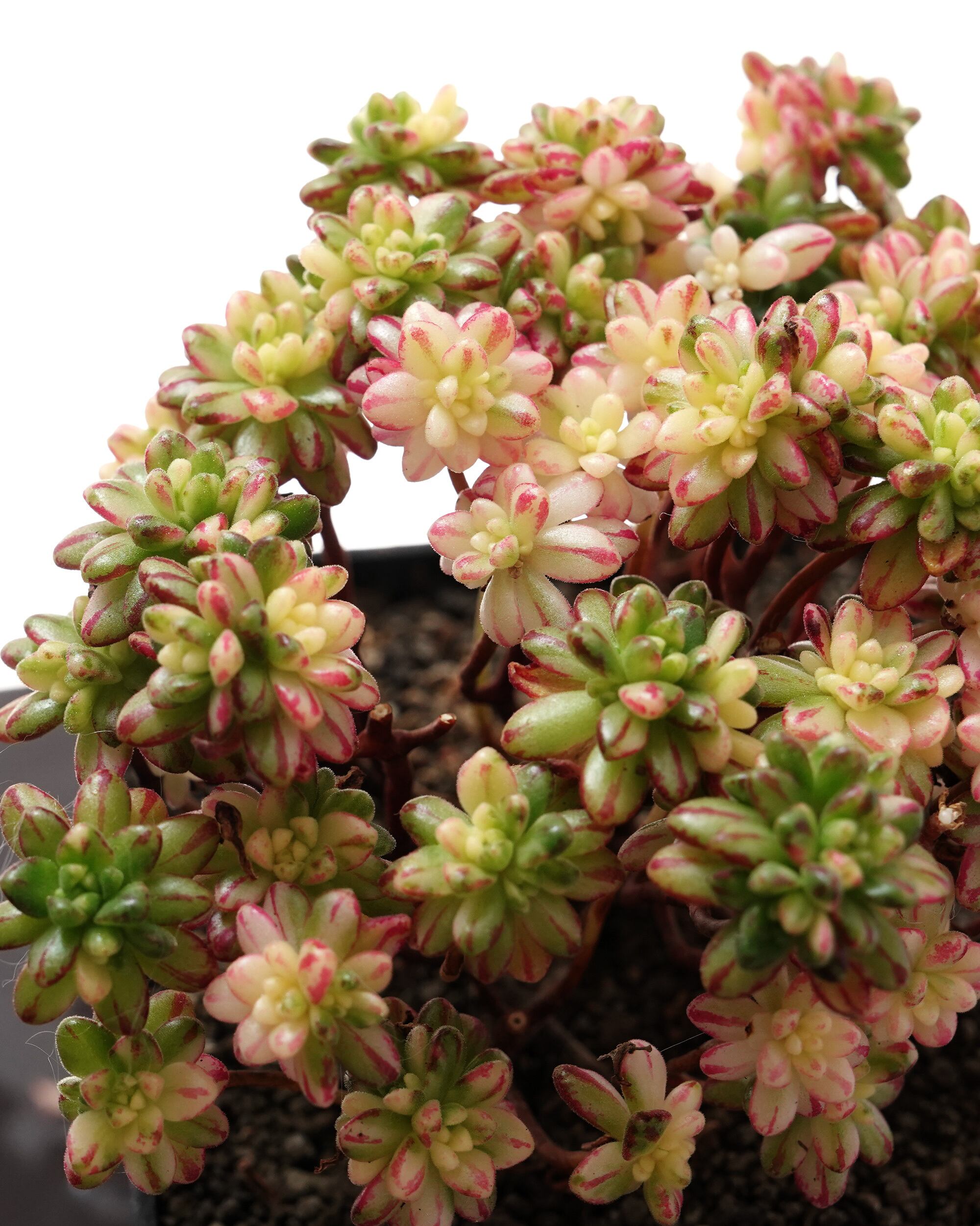 多肉植物界に突如現れた新星、「小人の祭り A. sedifolium」の斑入りタイプです。斑入りにより白い部分が増えたことで、赤い部分も一層鮮やかに引き立ち、明るく華やかな印象を与えます。小さなサイズながらもキラキラと輝くようなかわいらしさで、見る人の目を引きつける魅力にあふれています。